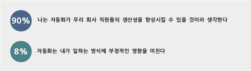 자동화에 대해서는 위협으로 지각하기 보다는 긍정적으로 인식하는 것으로 나타났다. 대부분의 응답자들이 자동화가 ‘조직원의 생산성을 향상(90%)’시키고, ‘업무 수행 방식에 긍정적인 영향을 미칠것(78%)’이라고 생각한 반면, 자동화가 ‘사람들이 수행했던 업무를 대처할까봐 걱정된다(31%)’, ‘ 업무 수행 방식에 부정적인 영향을 미칠것(8%)’ 이라고 응답한 비율은 낮았다.
