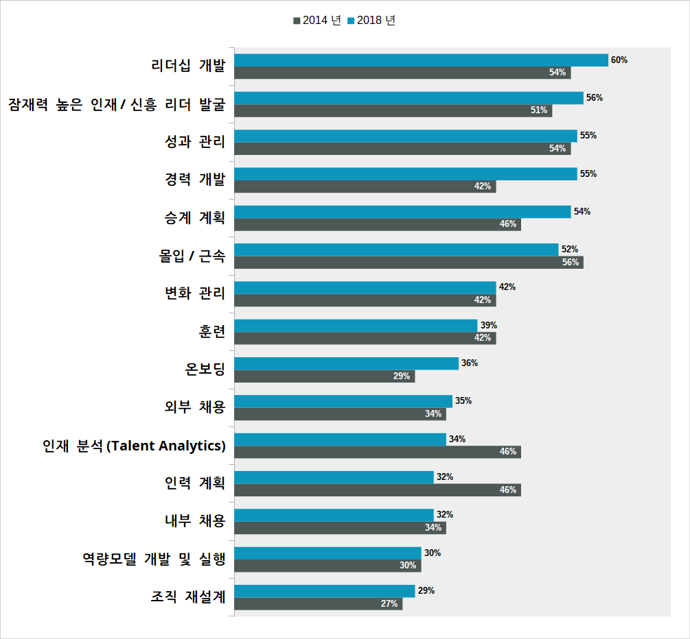 2014년 우선순위 7위를 차지했던 ‘경력 개발’이 올해 그 중요도가 상향한 것에 대해서는 “급속한 변화와 산업 전반에 펼쳐지고 있는 파괴(disruption)가 기업으로 하여금 경쟁 우위를 차지하기 위해 지속적인 학습과 스킬의 최신화를 요구하는 것”이라고 분석하였다.