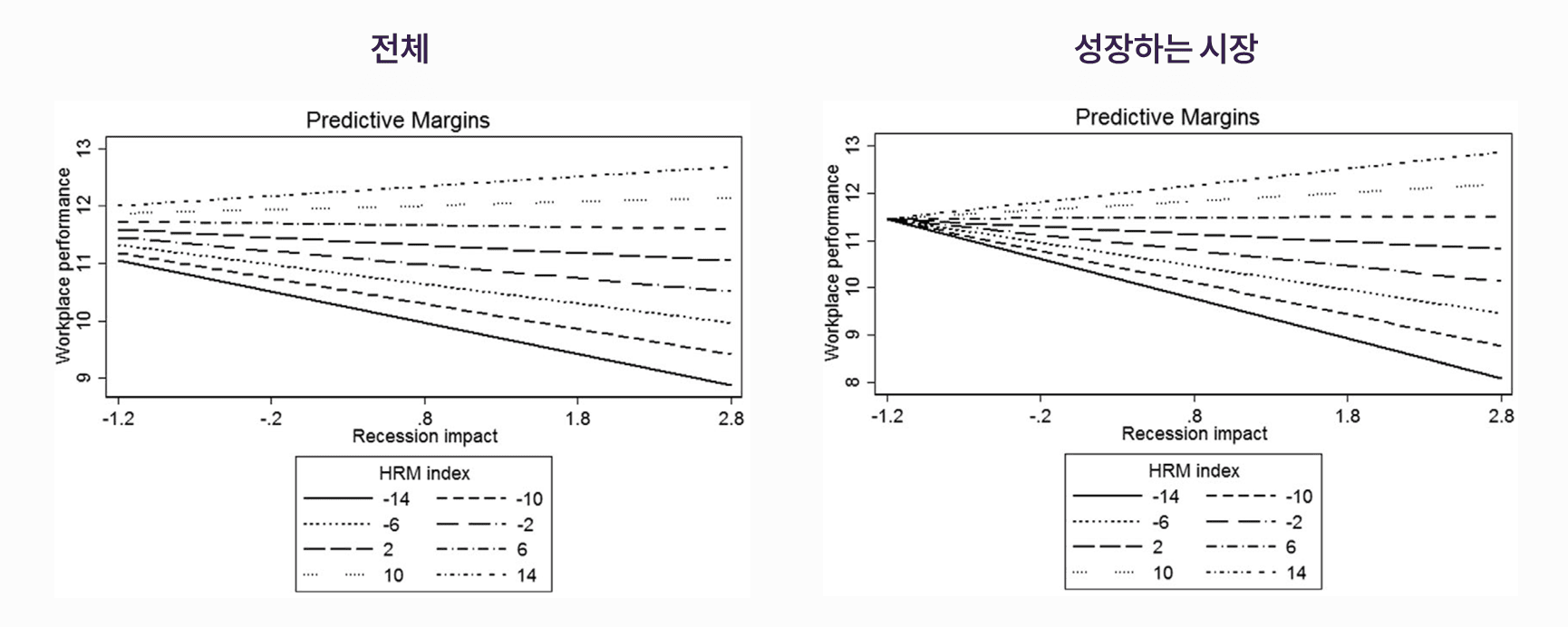 분석 결과 HR 프랙티스는 경기침체기에 조직이 위기를 극복하는 능력에 영향을 미치는 것으로 나타났다. 경기호황기에는 HR 프랙티스 수준에 따른 기업 간 역량 차이가 두드러지지 않았지만 경기침체기에는 이것에 따른 기업의 성과 창출 역량이 확연히 대비되었다. HR 프랙티스가 부실한 기업은 시장이 좋을 때에는 그들의 성과창출력이 HR 프랙티스가 견고한 기업과 크게 차이 나지 않았지만 경기가 어려워질수록 그들의 성과 창출 역량은 바닥을 보이게 되었다. 내부 역량이 탄탄하지 않더라도 시장 성장이라는 외부 요인에 의해 조직 성과를 창출할 수 있었지만 경제 위기가 닥치자, 즉 내부 요인으로만 환경을 대응해야 하는 상황이 오자 성과 창출이 급격히 떨어진 것으로 해석할 수 있다. 반면 HR 프랙티스가 견고한 기업들은 경기침체기의 상황에서도 이전과 크게 다르지 않은 안정적인 성과 창출력을 보여주었다.