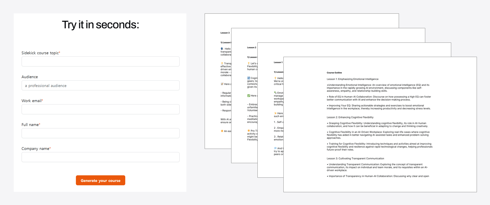 Arist는 교육 주제만 입력해도 단 몇 분 내에 교육 과정을 설계해준다. 오른쪽 자료들은 이메일로 발송된 교육 과정 자료의 일부이다.