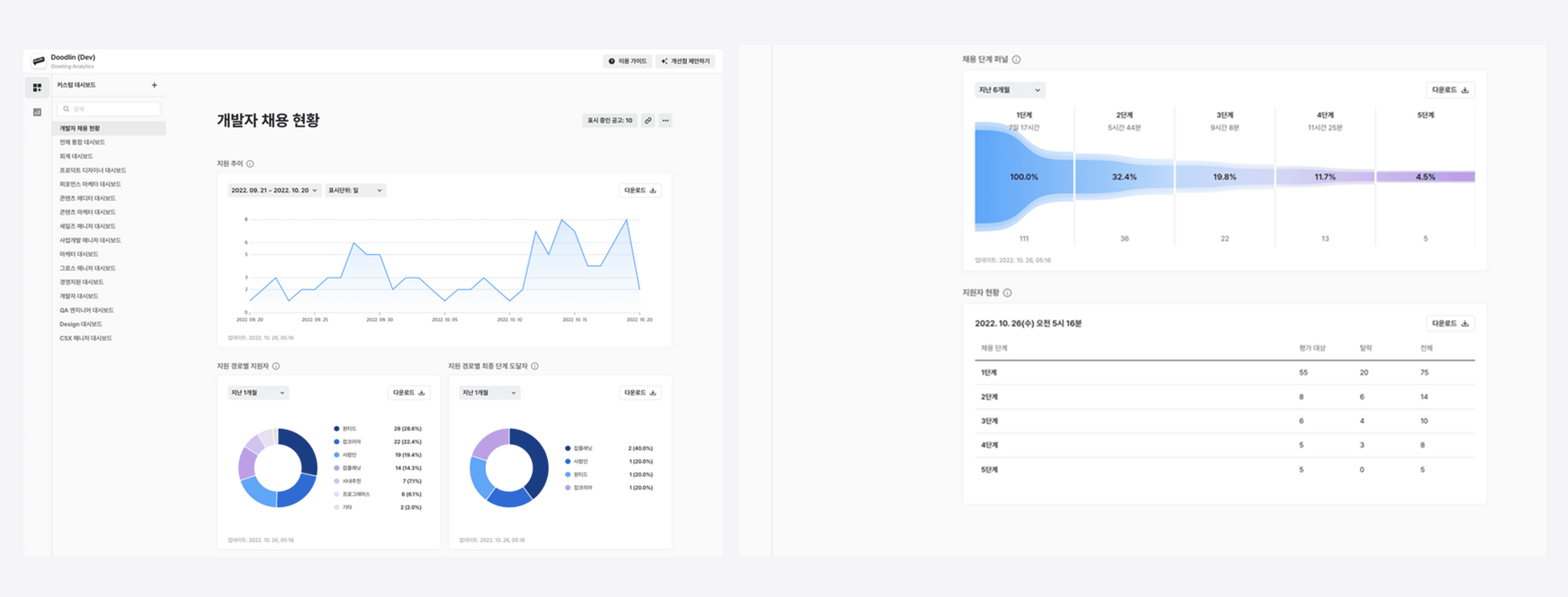 그리팅은 공고, 직군별로 지원 추이, 지원 경로별 지원자 수 등 다양한 분석 자료를 제공한다(이미지:두들린 제공)