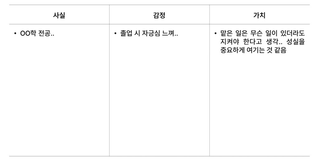 - 한 명씩 돌아가면서 ‘나의 이야기’를 발표한다. 이 때, 듣는 사람들은 이야기의 내용 중 사실, 감정, 가치를 구분해서 들어 본다.(하단 예시 참조) 상대방의 마음, 생각이 충분하게 이해되지 않으면 질문을 통해 더 알아 보거나, 자신의 반응을 공유해도 좋다.