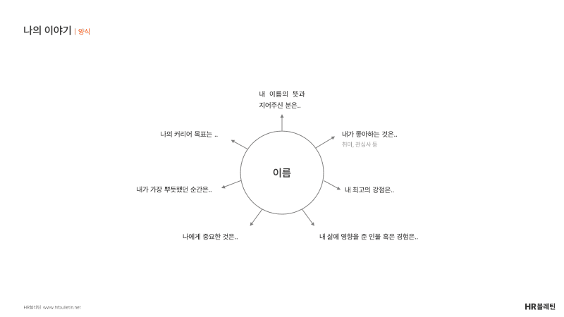 직장 생활을 하다 보면 오랜 시간 함께 일했더라도 서로 아는 것이 없다고 느낄 때가 있습니다. 마케터 홍대리는 잘 아는데 홍길동 개인에 대해서는 아는 것이 없다고 느끼는 것이죠. 이 활동은 팀원들이 서로의 내면을 공유함으로써 관계를 강화시키고 서로의 정체성을 이해하는 데에 도움이 됩니다.